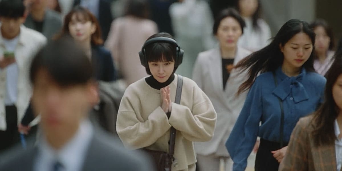 Tip — The revolving door: One of the drama's recurring devices is Young-woo's difficulty entering the office through a revolving door. Various characters help her in different ways across the series. The device functions as a running indicator of relationship — how different people respond to her specific difficulty reveals their character more economically than any amount of dialogue.